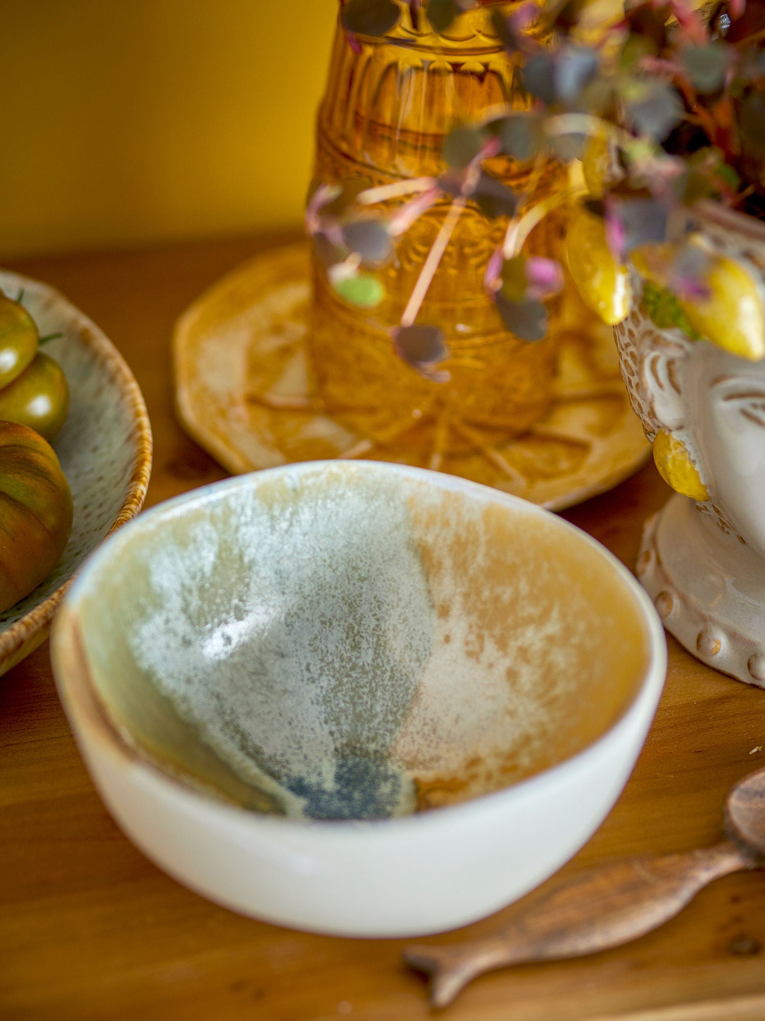 - Landhaus: Steinzeug, Leinen, warme Naturtöne